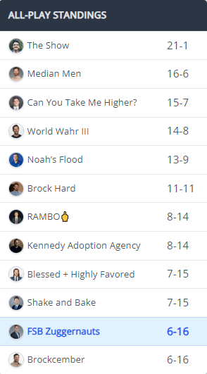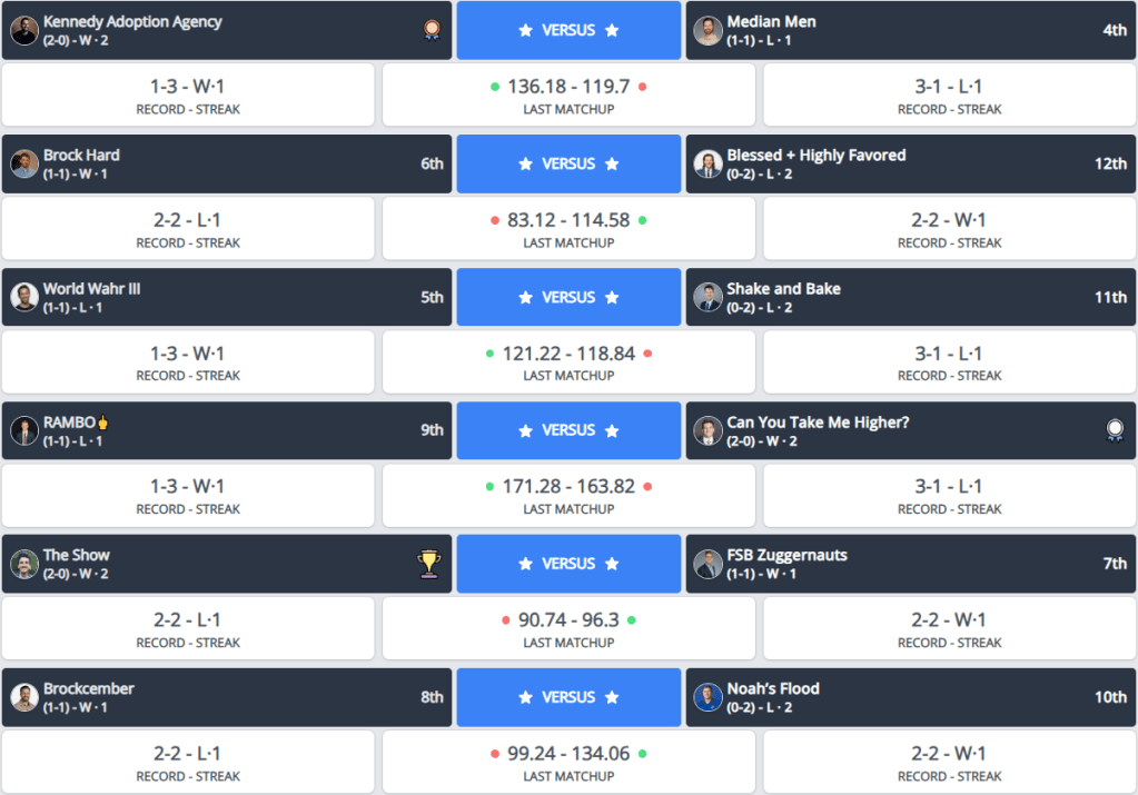This Week in History: In 2022’s Week 3, Cotton set the record for the Largest Blowout victory, beating Lamb’s Happy Endings (Him/Him) by 91.32 points. Cotton’s team was unnamed at the time.