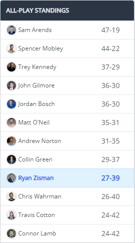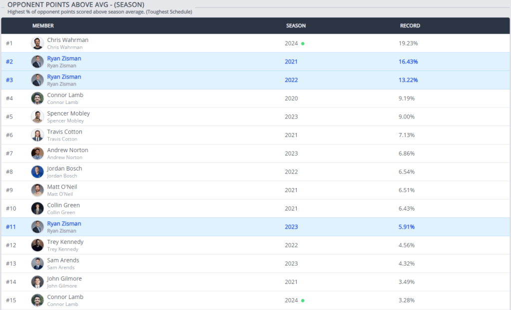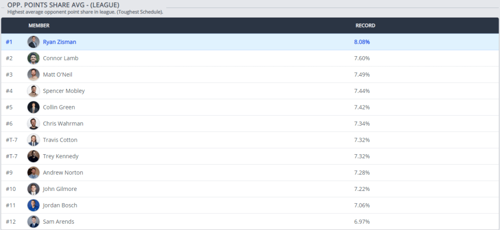 But the question lingers: Has Arends benefitted from an easy schedule? Much like the Bears’ victories over softer opponents, Arends has had the luxury of the league’s easiest all time strength of schedule. Still, ball don’t lie—his season-high 872.42 points show that he is the team to beat.