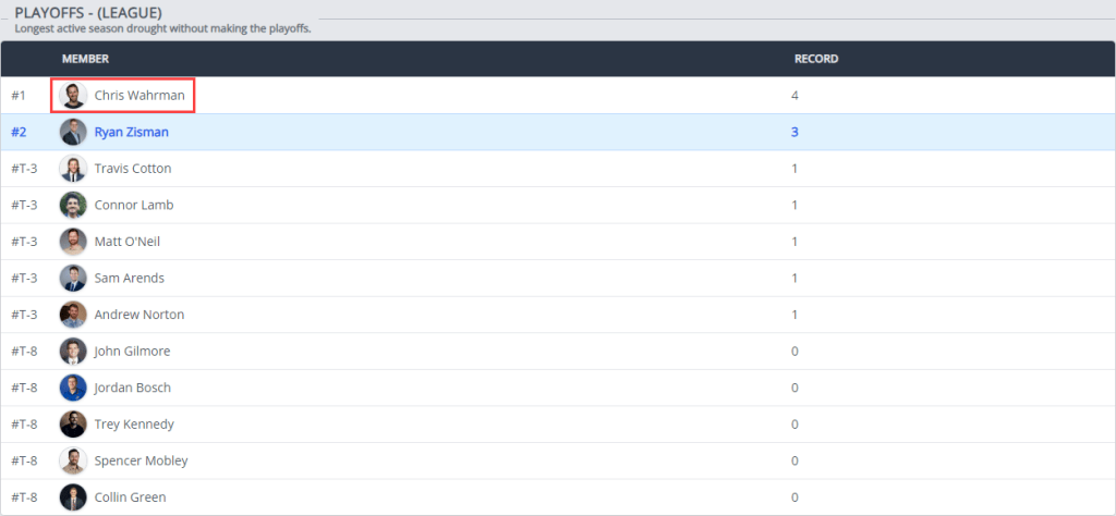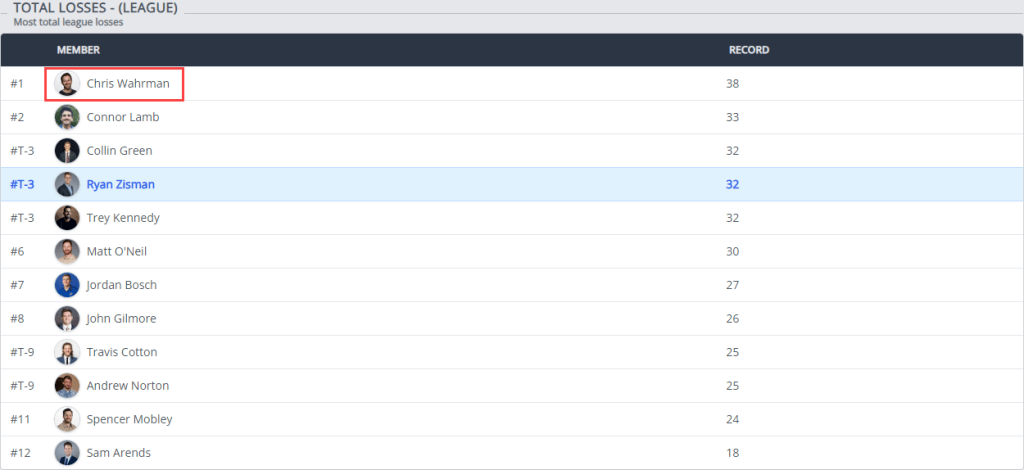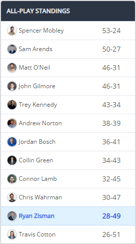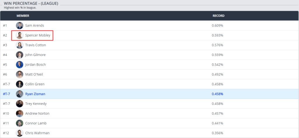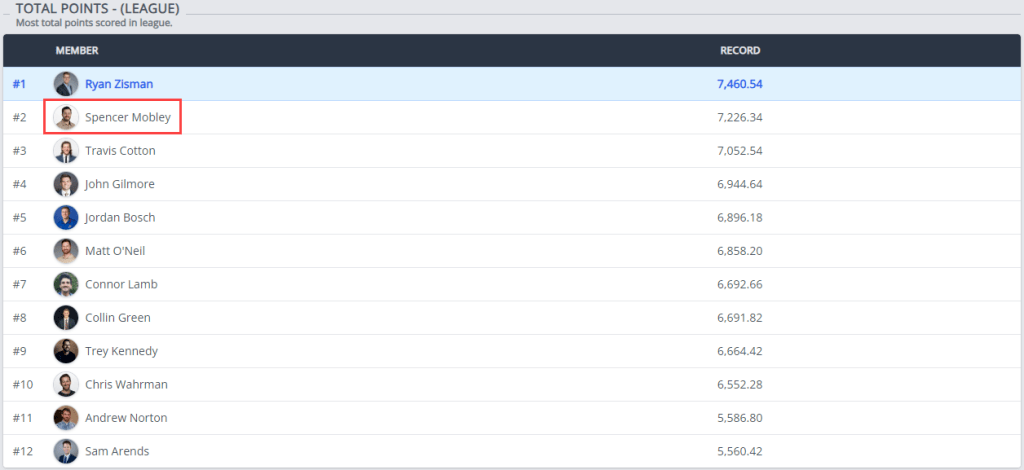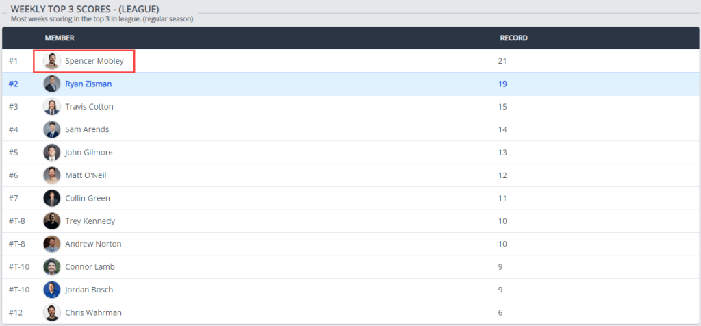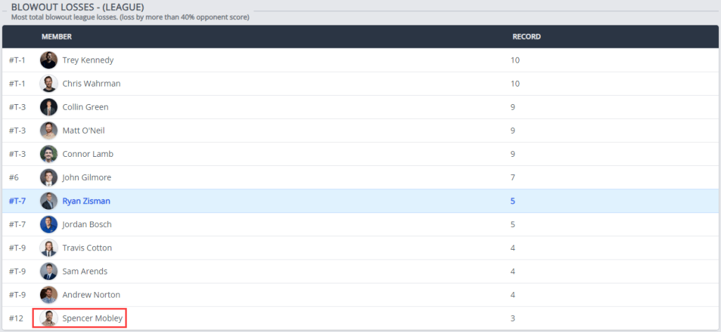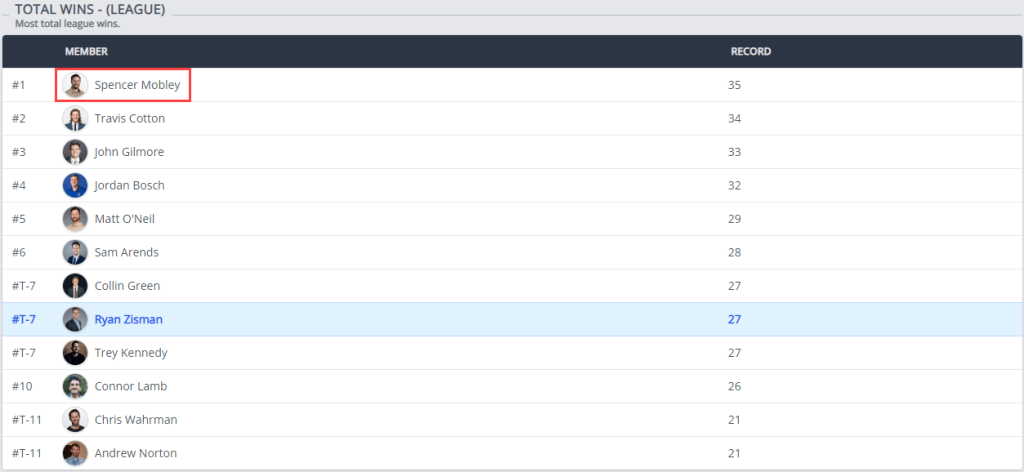In a shift of the league’s all-time standings, Spencer Mobley, general manager of the Sunday Scaries, has surpassed Travis Cotton to claim the record for most all-time wins, with 35 victories. As the league’s founding father, first-ever champion, and inaugural commissioner, Mobley’s rise to the top feels inevitable.