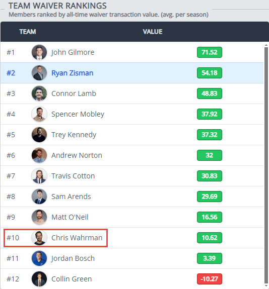 5. 10th in Team Waiver Rankings: