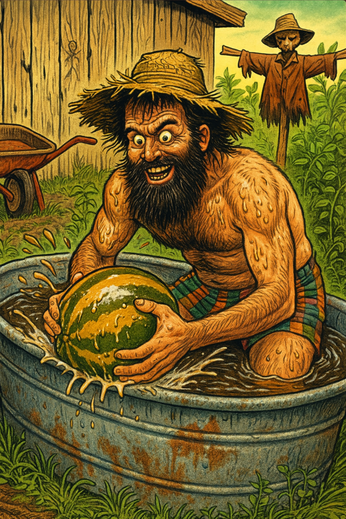 As we left the farm, he remained kneeling in the dirt, hands placed on either side of the watermelon as though communing with it. The sun dipped behind the barn, casting the pair in a long, unsettling silhouette. The wind rustled through the vines, sounding almost like a whispered chant.